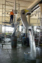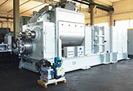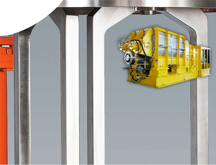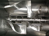 At the bottom of the trough is a discharge screw that runs below the blades. Once the batch is completed, the finished product is discharged by the discharge screw. The product can be discharged into containers or drums, extruded into special filtration systems, or into a variety of downstream devices.