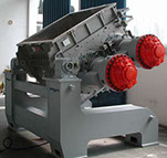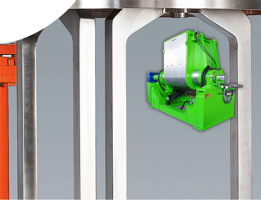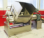 Battaggion Tilting Tank Kneaders, Model IPI, consist of two tangential sigma or masticating blades rotating at differential speeds, mounted inside of a U-shaped, horizontal trough. The trough may be constructed for atmospheric operation or operation under vacuum and / or pressure conditions. The trough may be jacketed for heating or cooling.