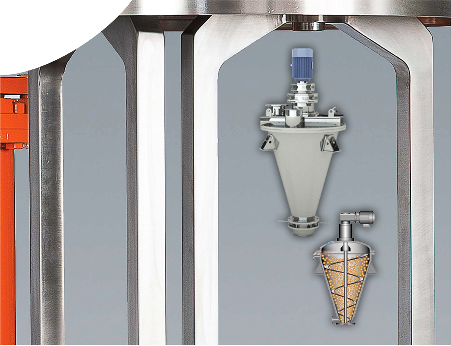 CMX Conical Vertical Ribbon Blenders/Dryers utilize a ribbon-type agitator that is mounted to a central shaft. The agitator is driven by a single gear drive.