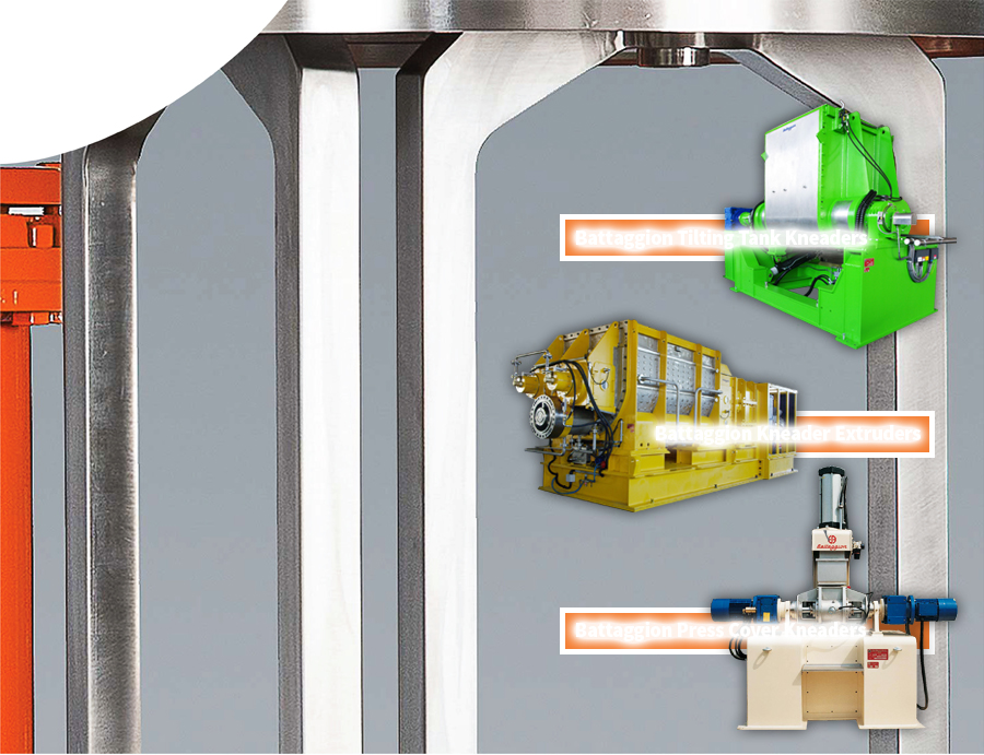 Battaggion Press Cover Kneaders combine either the Tilting Tank Kneader or Kneader Extruder configuration with a ram that applies uniform pressure on the material being mixed.