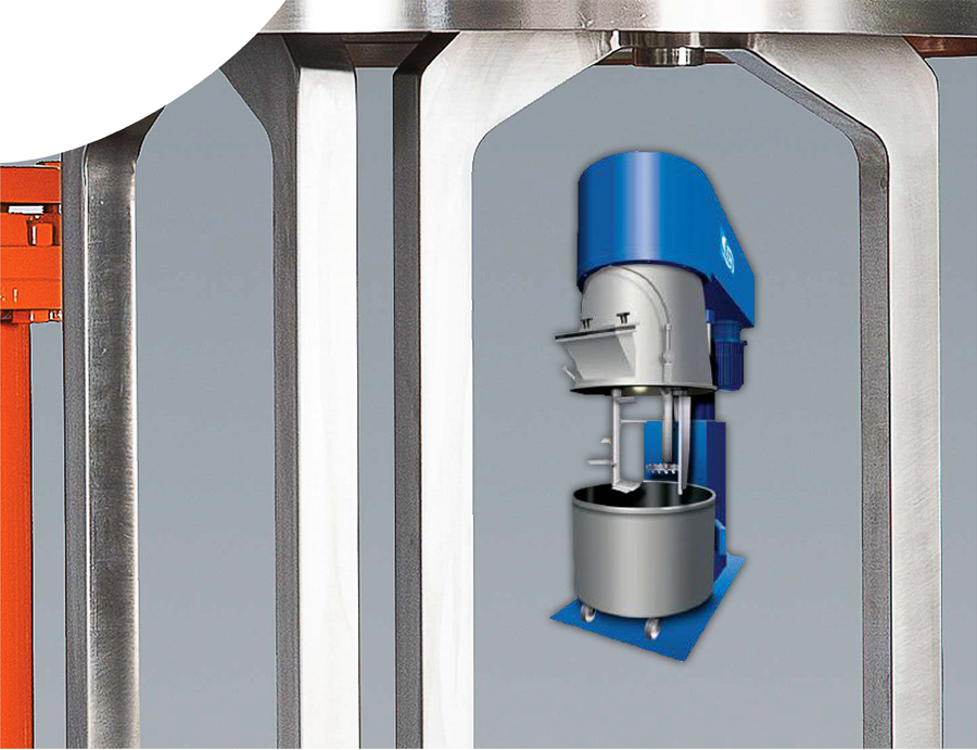 The Molteni Series RHD configuration combines a single planetary winged-stirrer with a revolving saw-tooth high speed disperser and a revolving scraper arm.