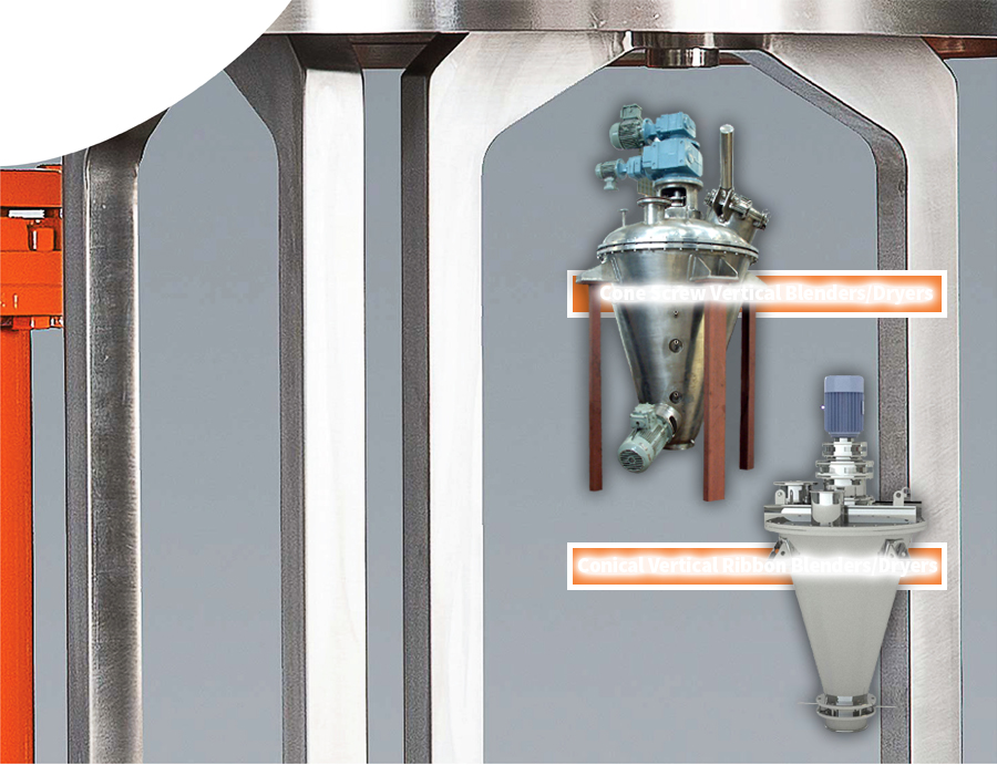 Vertical Blenders and Dryers have no shaft seals immersed in the product minimizing cross-contamination, or seal wear issues typical of horizontal dryers.